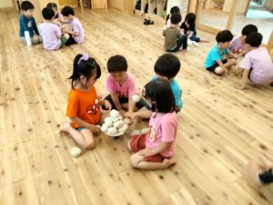 年長児を中心に積み方を話し合ったり、紙皿を抑える人・玉を乗せる人などの役割を決めたり、どんどん積み上げられる数も多くなっていきます!