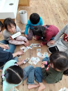◇保育室でカードゲームをする子ども達。