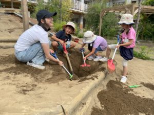 今日からふれあいエンジョイタイムが始まりました。30名近い保護者の方があそびの時間にいろいろな子ども達とかかわってくださいました!ホールでサーキット遊びをする際に応援してもらいながら遊んだり、保育室でお母さん先生と横に並んで絵本を読んでもらったり、つくルームでは様々な製作のお手伝いをしてもらいながら完成させたり、園庭で鬼ごっこや穴掘りをしたり!大人が入ることでより遊びが膨らんでいく瞬間がたくさんあり、充実感でいっぱいの時間になりました👍
