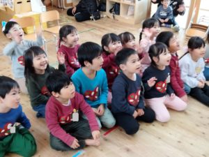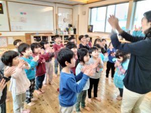どんなことが始まるのか…その期待が膨らんで先生が話す言葉や表情、遊びに釘付けの子ども達。言葉の意味が全てわからなくても、知っている曲だ!とアンテナを貼って内容を想像したり、色など身近な英語を元気に言ったり…「きっとこういうことを言ってるのかな?」と関連付けながら、新たな遊びを充実させていくようになります。子ども達の興味の幅を広げながら、様々な文化に触れる機会を大切にしていきたいと思います。