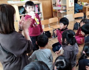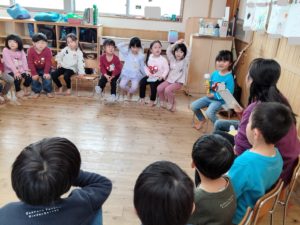 家庭で過ごした時間で経験したことや楽しかったことを自分の言葉で表現してみようと季節ごとに大事にしている時間。何を言おうか、どのような言葉で伝えようかと心の中で自己内対話をしながら発する言葉にはとても魅力があります。それを聞く際には、相手への関心をもって耳を傾け、もっと友達を知ろうとする…互いの思いが絡み合い、子ども達は気持ちをつないでいくのだと思います。伝える、聞くという言葉のやり取りの中には、相手に伝わる言葉の表現、表現する意欲等が含まれますが、更に奥には、気持ちのやり取りの面も大きいと感じています。