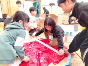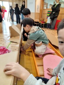 ワクワクタイムが始まりました。年中・年長の子ども達がピザ屋さん、温泉、迷路、カラオケ4つの中から好きなコーナーを選び、創っていきます。初日の今日はどのようなものを作るか話し合い、試作したりコーナーを作り始めたりしました😊ピザ屋さんは生地の縁をふっくらさせるために何を使ったらいいかや、大きな円の状態で提供するのかを話し合います。「お客さんがもらった時に切ってある方がいいと思う」という声に、切り分けられるようマグネットで作るのはどうかという意見も出ました👍迷路コーナーでは周りが見えにくくなるよう壁を作っているグループがありました。マットにダンボールをつけるために内側からガムテープを貼ったり、外側と床を養生テープで止めたりしながら上手く壁が立ち上がるか確かめます!重さで上手くいかない時にはガムテープの量を増やして様子を見ていました。また、溶岩の道を作っているグループは、溶岩に見立てたポリ袋の上を歩いてみるとずれてしまい、すぐに壊れたり通りにくかったりすることに気づきます。ガムテープで補強しながら、より頑丈なものを作れるように試していました🔥