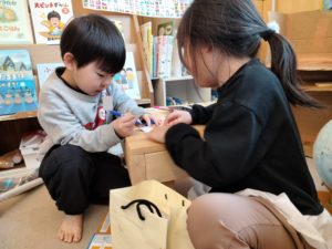 カラオケではデンモクに曲名を貼り付ける際、年中児に年長児が文字を教えて書くのを見守ったり、座るためのベンチを準備しようと年長児が声をかけて一緒布を掛けたりしながら、創っていきます🎵画面に映る歌詞や、注文に応じて出せるように食べものも準備しながらお店の雰囲気を再現しようと進めています👍