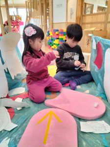 ピザでは耳の部分を紙粘土で作ったり、具材を何で作るかを決めたりし、役割分担しました🍕あと何枚くらいあれば足りるか確認しながら作っていきます😊また、入り口になんのお店かがわかるように看板をつけようと、ロフトに骨組みを設置!看板の長さに合わせてどれくらいの長さが必要かを何度も確認していました!