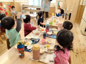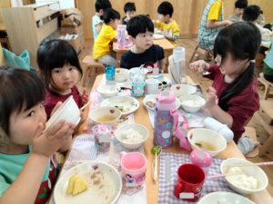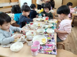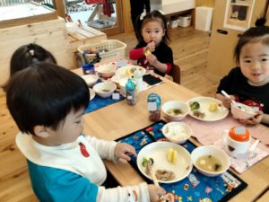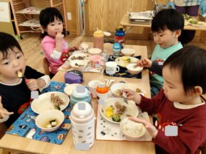 お昼が近づき、食事の準備をしている子ども達の様子を見ていると、少しずつ流れがわかってきたようです👍2歳児クラスでは保育者がランチマットやコップを見せながら「〇〇はありますか~?」と問いかけると「はーい!」と知らせる子ども達。「見て~!(自分で準備)やったよ」等、伝えたくて仕方がない様子😊保育者との関係性の中で自分の事を発信することができるようになってきたことを感じます✨また、年少組でも食後の片付けや歯磨きの流れを覚えてきており、残った食事や持ち物をリュックに入れるまでの片付けを丁寧にしようと、保育者と一つ一つ確認しながら始末しているところです。