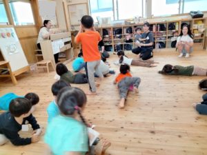 ムーブメントは音の速さ、強弱、高低などに合わせて身体を動かす遊びです。音を聴いたその場で反応するため耳を傾けて集中する遊びともいえます。聞いたことのないような音が出た時には子ども達に「この音ってどんな動きだと思う?」と投げかけたりしながら、様々な組み合わせの動きを楽しみました。今日はグループを決め、その友達を探す遊びをムーブメントの中に取り入れ、合図で集まる(ムーブメントの中ではナンバーコールとも呼ばれます)ことで、ちょっとした緊張感と、友達を見つけた時の安心感(緩和)を味わいました。いつも同じ展開にならないのが面白さ。子ども達とワクワク感をこれからも楽しめる時間をつくっていきたいと思います。