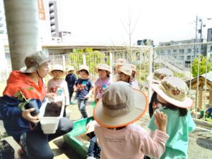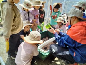 先日アサガオを植えた時には花が咲くのを楽しみにしてほしいと植えるものを伝えたのですが、今回は花と野菜の生長過程の違いを知り、実のなり方にも期待をもってほしいとあえて何を植えたのかを伝えていません。育ててみることで、より毎日のお世話が楽しみになりますね。その時間が植物を大切に育てる気持ち、食べてみようとする気持ちを育てていきます。さて、何の野菜かは育ってからのお楽しみです!