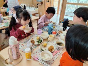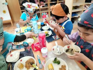 一緒に食事をする人同士が気持ちよく机を囲むことができるようにするためにマナーがあります。今は幼い子どもですが、マナーを知り、経験を積み重ねることで身に付き、将来社会に出てからも活かしていけるのではないでしょうか。健康面においても背筋を伸ばして食べることで消化機能を助け、栄養吸収もよくなるというメリットがあります。食べこぼしを防ぐために椀を持つ、所作が美しく見えるよう背筋を伸ばすといった良さは、他の事でも置きかえることができます。ご家庭でも、改めて食事のマナーについて話題にしていただけたらと思います。