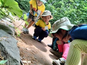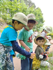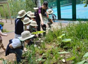 既存の遊具にはない楽しさを感じられたらと、広場で氷おにやバナナおにで身体を沢山動かして遊びました。その場にある植物や生き物を眺める面白さ、草木の香り、外の音等、たくさんの出会いを楽しんだ一日。道具や遊具がなくとも、楽しめることはたくさんあります。自分の五感を通して発見したことが心に残り、イメージや感性を豊かにしていくことでしょう。このような価値ある時間を保護者の方とも共有したいと考えています。