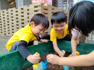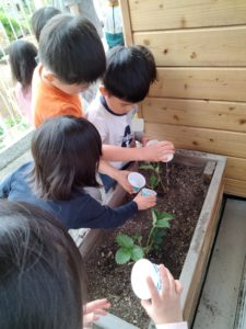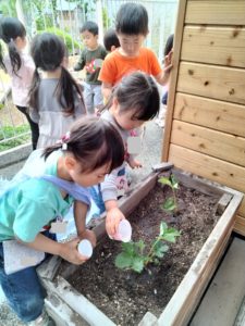 先月から農園で植えるものは土の中にできるものだからと、園で植えるものは目で見えるものというテーマで苗を選びました。イチゴとトマトの苗の匂いを嗅いでみようと顔を近づけると、「トマトくさ~い」「でもイチゴはあんまり匂いしないね」と話す等、「どのようなものなのか」を知ろうとする探求心がお触れています。また、土と培養土を比べて土はザラザラ、培養土はフワフワといった感触の違いも確かめるなど、自分で触れる経験をしたからこその発見につながりました。生きるものが目の前で育つのを見ることができる経験は、「いつ?なぜ?どうしたら?」といった疑問をたくさん投げかけてくれるような気がします。栽培の魅力をこれから数か月存分に味わってほしいです!