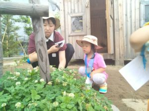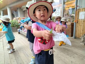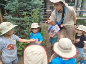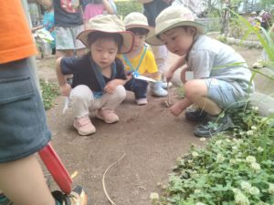 暑くても外に出るきっかけが増えたらいいなと、保育者と一緒に自然を探す遊びをしました。いつも遊んでいる園庭の中ですが、じっくりよく観ることで見えなかったものが見えることも。新たな発見や一瞬の出会い(今回の場合だと虫など)で心を潤す経験になったらいいなと思っています。これからも園内をめぐる遊びを計画していきたいと思います。