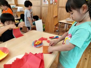 年少組で七夕飾りに使う星の色を絵の具で塗りました。水色やピンク、黄色等の色から好きなものを選び、筆を横にすっと滑らすと綺麗な色になりました👍一色を何度も塗る子もいれば、ちょんちょんと色を載せては違う色もお邪魔するスタイルの子も😊時々、色が混じり合うと「うわぁ~✨」「オレンジになった~✨」と喜んだり驚いたりすることもありました。そのワクワクした気持ちがとても素敵でした💗年中組も飾りを完成させようと作っていたお花を組み合わせ、下に染め紙の吹き流しを下げると、素敵な飾りに変身🎵今日も花を作る子がおり、手前、反対…と繰り返し蛇腹折りを真剣にする子ども達でした😊