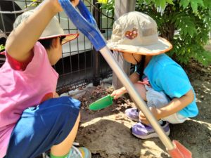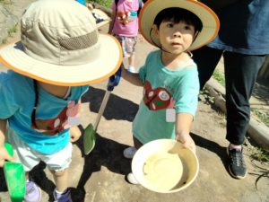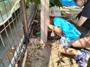 見つけた時の喜びを共有した瞬間の笑顔が本当に輝いていました。ダンゴムシが動いている姿を見ながら、手足の数や羽の有無といった自分とは違う身体の形、動き方の違い等を観察を通して知る、子どもにとって魅力的な時間だったと思います。見つけたことで「どこにいる」「どのように取ったか」を友達に伝えることもあり、その後一緒に探すきっかけとなったり、虫について新たに発見するきっかけとなったり。身近な自然に触れながら生き物に目を向け、興味関心を広げていけるといいなと思います。