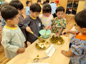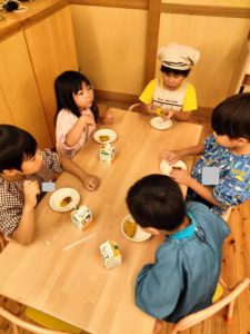 材料を入れたり混ぜたりしたいだろうと、年下の子の気持ちを汲み取ろうとしている年長児の自然な姿が頼もしく、また、自分達でパンケーキが出来上がるまでの工程を把握してみんなで進めていく姿を見ていた年中組は年長児に憧れの気持ちを抱いただろうなと思います。ホームフレンドサークルはアットホームな場や生活をする場をイメージしています。お家で過ごす時のように料理の香りがしたり、ちょっと好きなことをしてまったりしたり…そのような暮らしの場として過ごしていけるよう、過ごし方をこれからも考えていきたいと思います。
