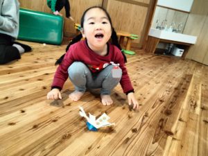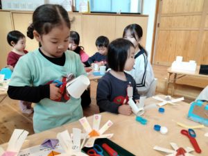 今回、1・2歳児もたくさん作りに来ました。紙コップが切れてるもの、自分で切るもの、すべて自分できるものと様々なものが置いてあり選ぶことができました。紙コップの飲み口の部分は硬いため、ハサミを入れるのには力が必要です。手の動かし方、紙コップを支える指の置き方等、保育者が一緒に遊ぶことで道具の使い方もゆっくり確認していきました。年中、年長児はより細かく切り込みを入れてみたり、キャップを2個重ねたりという自分のオリジナリティを加えながら工夫を凝らします。回しやすさ、見た目の美しさ、よりたくさん回るように等のこだわりも見られ、年齢によって製作にも違いがあることがわかります。あそびの時間は様々な学年の子が入り混じっていますが、それぞれの発達段階でそれぞれが楽しめる環境が必要ですね。