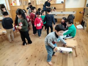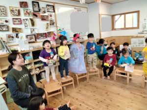 お客さんがいることで、子ども達の意識も随分変わることがわかります。見てもらっているという程よい緊張感があり、それでいて自分の好きなことを披露する楽しさがある。また一方で緊張感の中から自分を奮い立たせるような心情もうかがえる…自分が今いる場面(ステージに上がる・接客する)に応じてどのような言葉を選択して遊びを盛り上げるのか、どのような表現で自分らしさを出してくのか等、子ども達自身が考える「私の振る舞い方」に成長を感じます。3歳児はこのような遊びを通じて、徐々に友達とつながっていることがわかりますね!