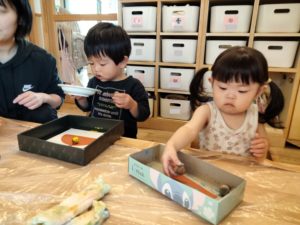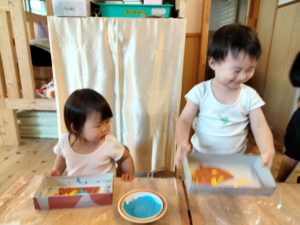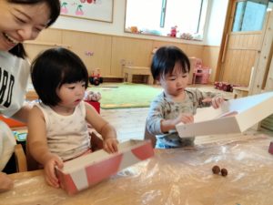 製作の準備をしている時、子ども達は椅子に座っていたのですが、「(僕も)やる~!」と言って立ち上がるほど興味津々。手順を伝える際にも保育者の見せる手本をじっと見つめる姿が印象的でした。実際に転がす時には箱を揺らすだけでなく、上にちょっぴり飛ばすように動かしたり、「きいろ」「あお」と色を選択する等、「自分で」という想いが伝わってきました。1歳児のワクワク感が伝わり、この期待感や体験で得られる満足感を大切にしていきたいと感じた日となりました。