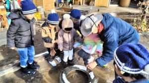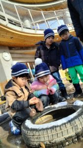 あそびの時間、雪がうっすら見えている中で元気に遊ぶ子ども達。ふと目をやると、タイヤの中に動くものが目に入り「なんかいる!」のぞき込んでみます。そこで生き物に詳しい先生を呼んで取り出してもらうと…なんと蜘蛛!「寒いのにどうして蜘蛛なんかいるんだろう?」と不思議そうでした👀蜘蛛を取り出して、園内にいるトカゲの餌にすることになりました。