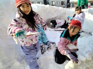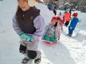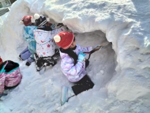 真っ白な雪の中に出てみんなで遊びました⛄大型滑り台にできた新しいコースで滑ると想像以上のスピード‼そのスリルがワクワク感を倍増させ、繰り返し行列ができるほどキ👀ャーと叫びながらもいい笑顔です😊また、周回路では友達を乗せたそりが行き来します🛷手のひらでぎゅっと紐を握っていざ出発🎵「がんばれがんばれ🏴」と乗車のお客さんからエールも飛び出しました👍2階でイグルーづくりをしていた年長児。「大きいのは下にした方がよさそう」「隙間にも少し雪を詰めた方がいいかも」等、大きさや形、組み合わせ方を自分達で試行錯誤。完成が楽しみになりました✨