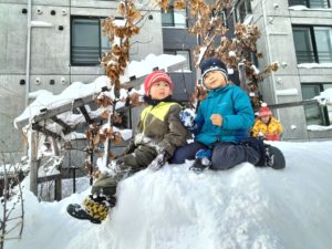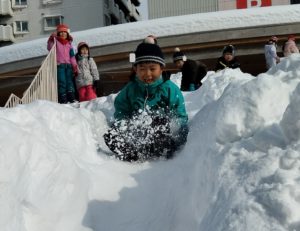 雪のない地面では届かなかった高い遊具にも上ることができ、いつもと違う景色を楽しんだり、高さのある山の向こうでは全く違う遊びが展開されていて新たな興味が広がったり。大雪が恵みとなり、園庭遊びの可能性をより広げていけそうです。