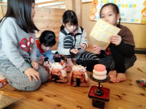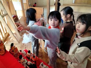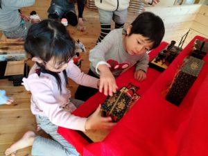 箱から出した際、一つずつ梱包された人形が傷まないようにと、養生テープをそっとはがしたり、優しく持ち上げていた子ども達。説明書を見ながら人形の種類や持ち物について話題にしていましたが、これからなぜその小道具があるのかといった疑問を自分たちなりに調べたりし、行事の意味なども知っていくことでしょう。みんなのもの、壊れやすいもの…大切に扱わなければという繊細さが伝わり、成長を感じました。