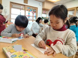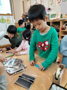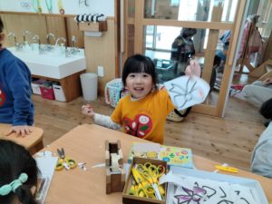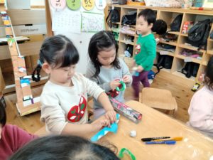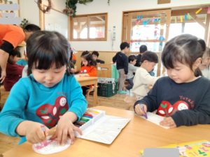 卒園式に向けた活動を見て、より年長児の姿に憧れを抱いた子ども達。それもあり、来週プレゼントするうたに「ありがとう」「おめでとう」の思いを込めて歌ったり、 完成した時に喜んでもらえることを想像して製作したり。自分の事から他の人に目を向け、人を大切に思うということがどのような感情なのかを知る素敵な経験となっています。