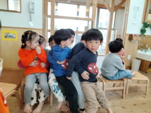 先週から、いちご組と年少組で縦割りの交流を楽しんでいます。今日はこぐま組とお引越しゲームをして遊びました🏠はじめは緊張した表情をしていた2歳児も、お兄さんお姉さんからコミュニケーションをとってくれることで楽しんでいました👍また、いちご組の友達も同じ空間にいることで「ドキドキだけど安心」そのような想いも感じられました😊新しい環境で緊張しながらも、進級に向けた期待があるようです。また年少組にとっても、この場を譲って新しい場所(年中組)に行くという気持ちの整理もしているよう。互いにとって意味のある時間を過ごすことができました!