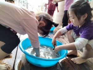 年中組は大掃除をしました。保育室はもちろんですが、みんなで使用した画板などもピカピカになるまで磨きます。強くこすって綺麗になっていくのを見て、更にやる気が出てきたよう👍最後は桶に貼った水の中で雑巾をゴシゴシ洗って絞りますが…隣の桶も気になって移動しているうちに床が水浸しに💦雑巾を干して大掃除はおしまいとなりました!手首の返し方、力の入れ具合も以前よりしっかりしてきたことを感じた一方で、高い場所から絞ると水が床に拡がることや、袖をまくらずに洗うと服が塗れてしまう等、今後知っておいたり身に着けておくとよいことも見えてきました。身の回りを整理整頓することで園のものや自分のものを大切にしようとする気持ちにつながったり、綺麗になることでの心地よさを感じたりしてほしいです。新たなクラスになることへの期待感にもつながっていきますように🌟
