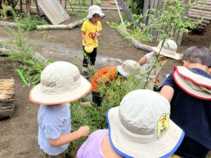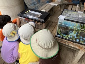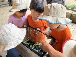 夏休みに入り、草むらからコオロギが出てくるようになったので、今日は飼育している「ヒガシニホントカゲ(かげまるくん)」「水色のアマガエル(けろろくん)」のエサとなる虫を子ども達が探しています!