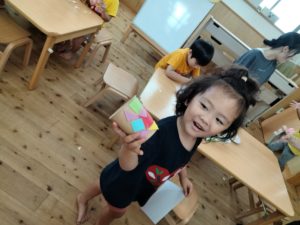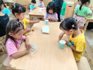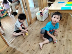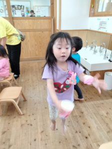投げ方を変えたり、玉を丸め直したり、カップを床に置いて上から玉を落としてみたり、年少児なりに試行錯誤してより楽しめる工夫をしていました!!