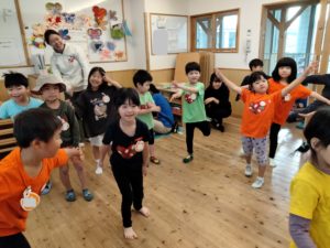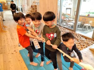 年長組のお泊り会2日目の今日、目覚め始めたのが5時30分頃と例年より遅く、次々と起きても静かに目を開けて待っている(笑)パジャマを脱いだら朝からみんなでおまめ体操🎵楽しく遊べるよう、身体をほぐします。