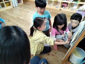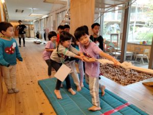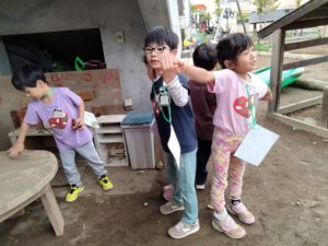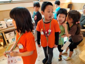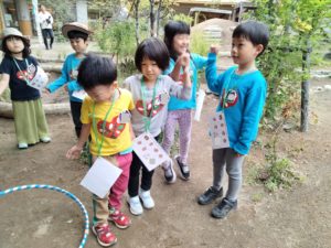 朝食でおなかを満たした後は「先生を探そう!」と題してみんなでかくれんぼをしました!どこかに隠れている先生を見つけたら一緒に遊べるお楽しみ😊しっぽ取りやフープくぐり、伝言ゲームやなべなべそこぬけ等、次々にミッションが課されます❕最後は園長先生のミッションですが、隠れている場所が最難関…しかし全グループが園長先生の出すミッションをクリアして、クラスのお花をもらいました👍